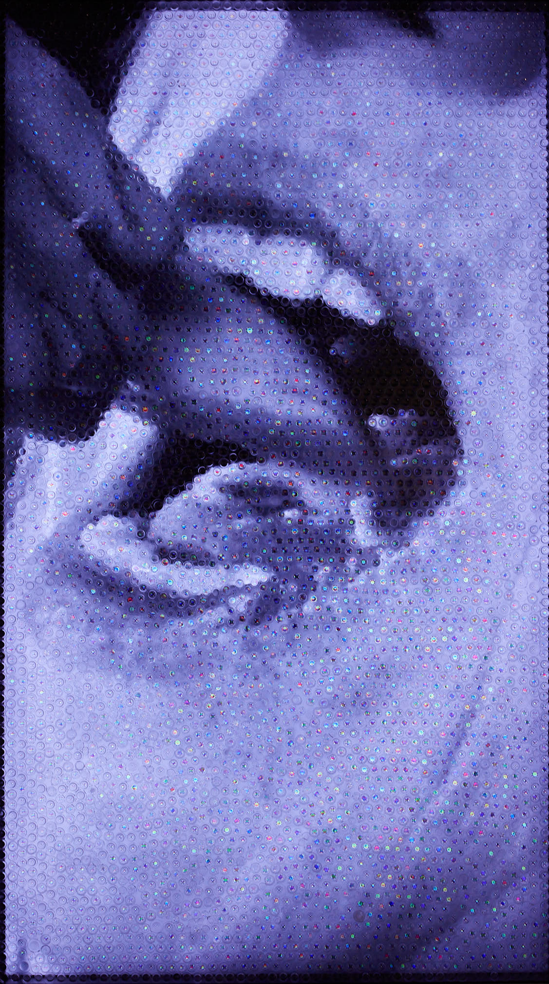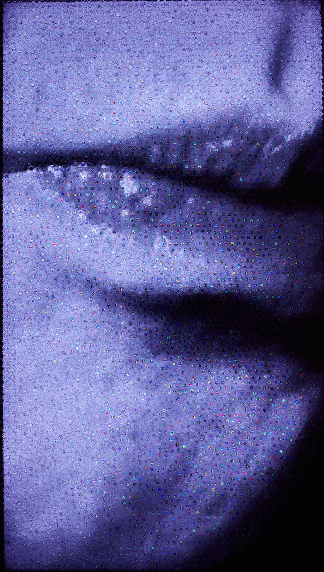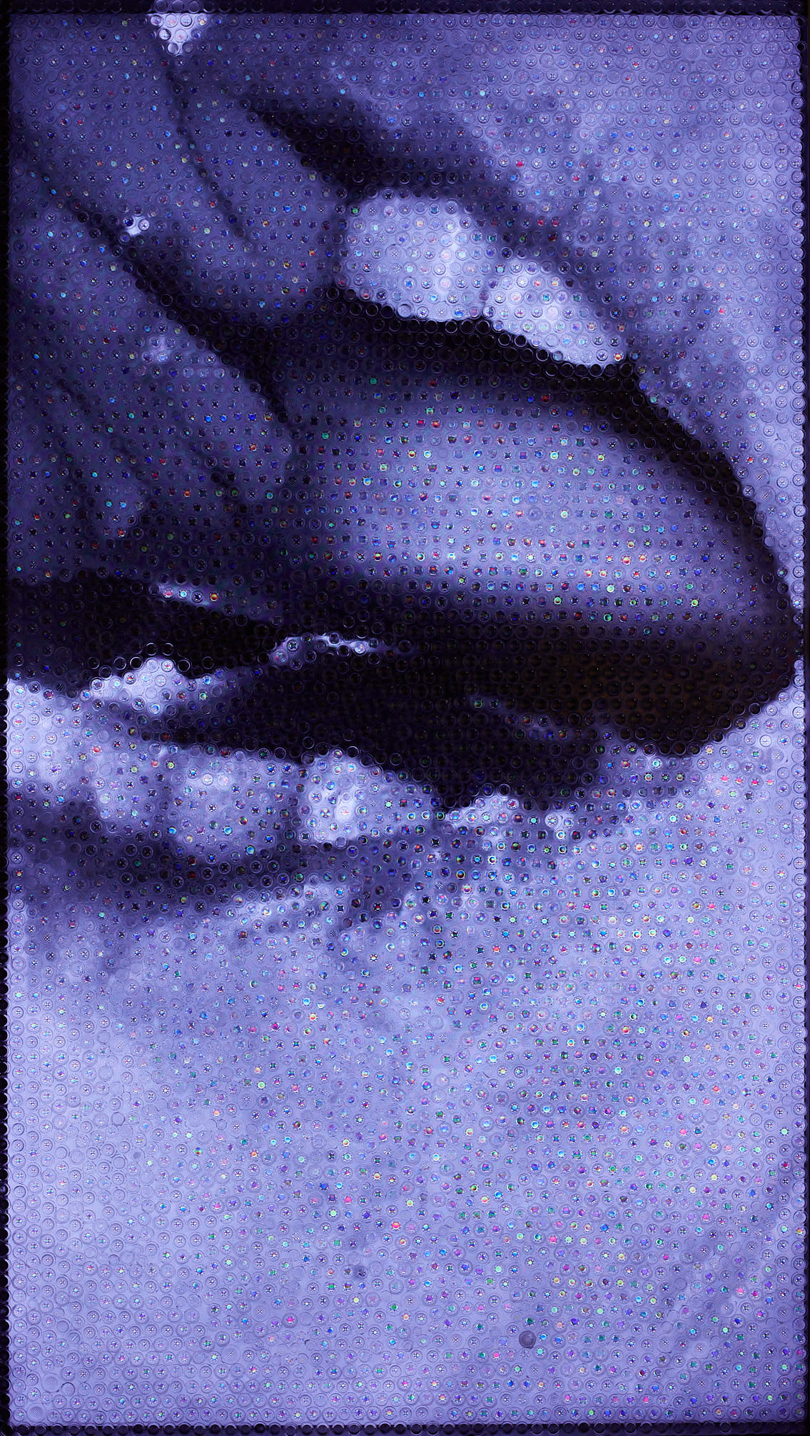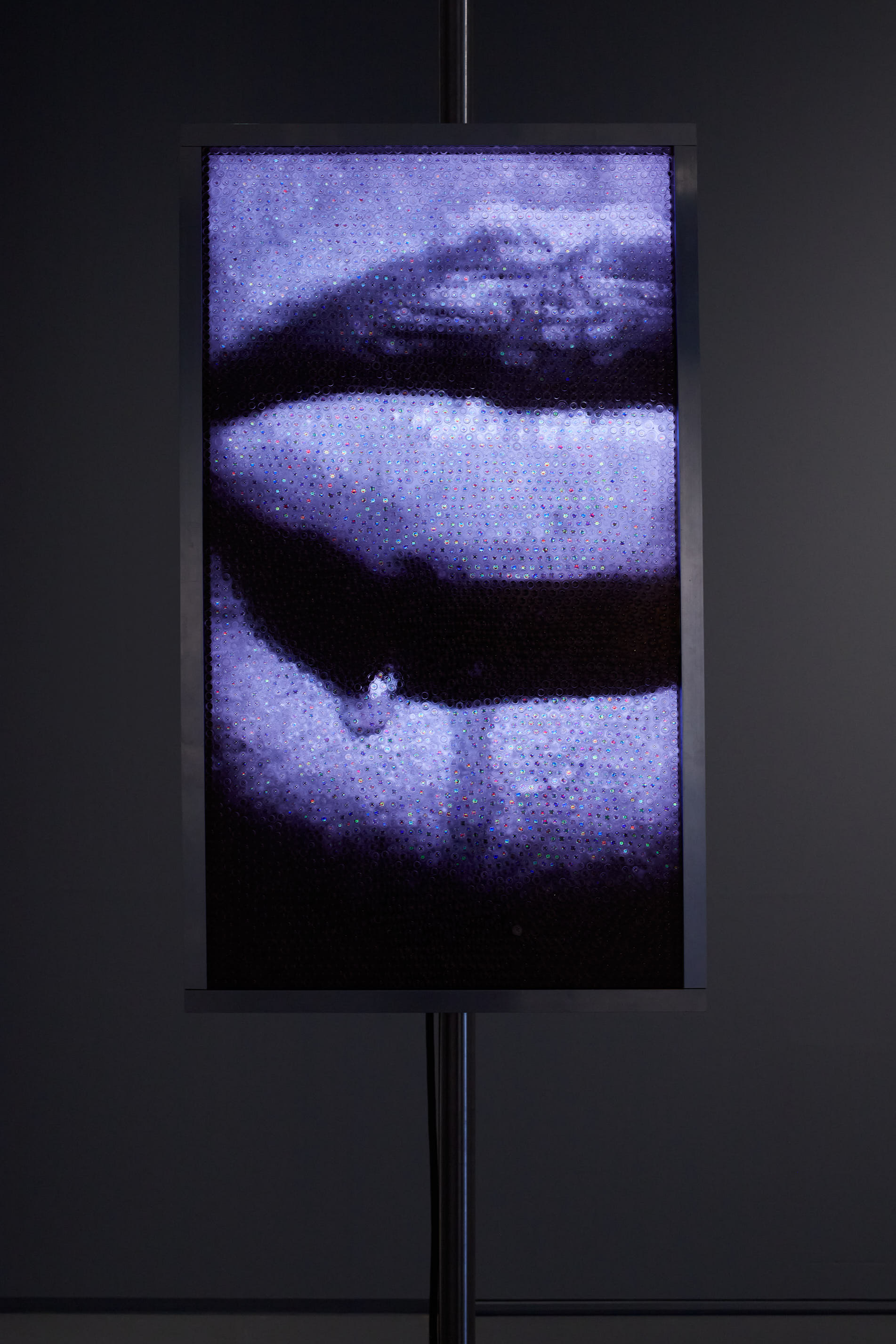 Picture Element deliberately slows the circulation of images. Lenses salvaged from used disposable cameras, placed in front of a video of mouths eating, transform the screen into an unstable, hypnotic optical surface. The image only reveals itself through the viewer’s movement and the time they are willing to grant it. Presented like a storefront advertising screen, the installation diverts a device intrinsic to the attention economy: the mouths, associated with bodies historically monitored, disciplined, and sexualized, are neither offered nor consumable. Filtered and slowed down, they elude regimes of visibility that demand clear, fast, and immediately available images.